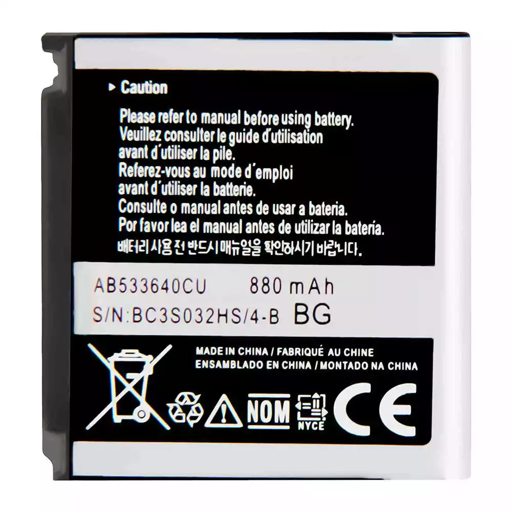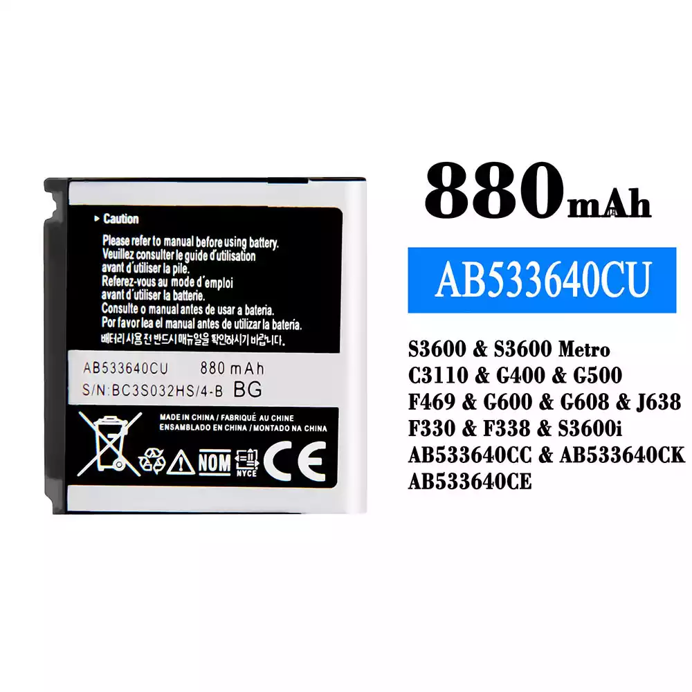Model baterai AB533640CU for Samsung S3600/S3600 Metro/C3110/G400/G500/F469/G600/G608/J638/F330/F338/S3600i/AB533640CC/AB533640CK/AB533640CE
